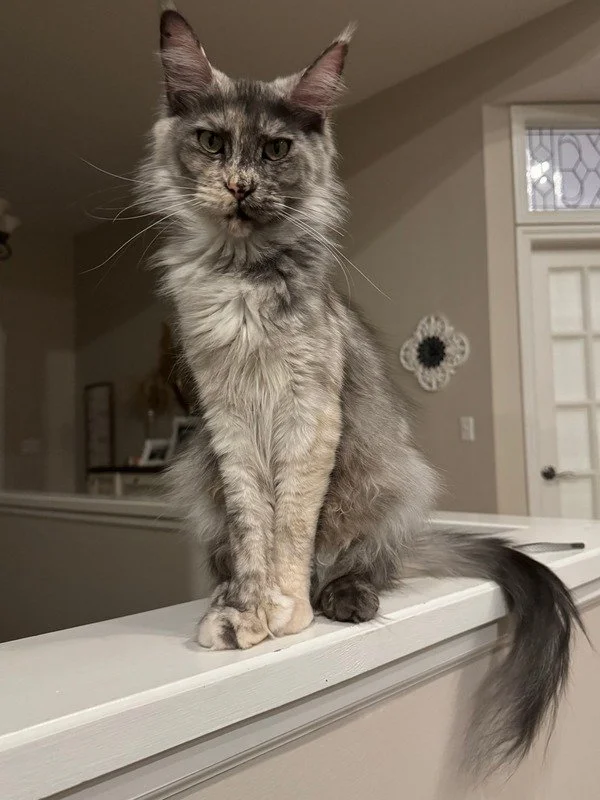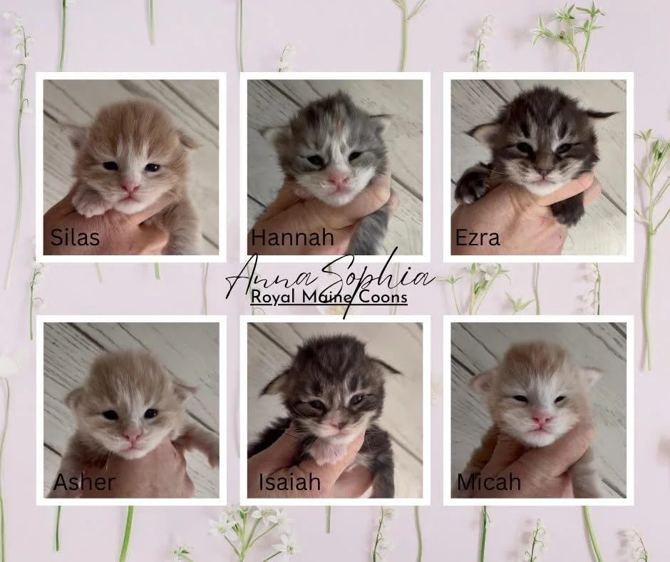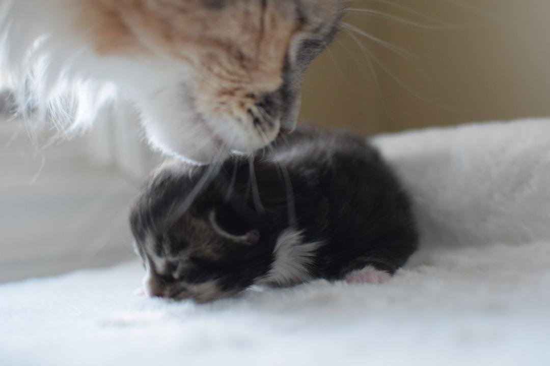 Sasha our Blue Torbie with white Queen and Merlin a Black Silver Tabby from MI Maine Coon welcomed our first litter of the year March 12th! 5 boys and 1 girl.