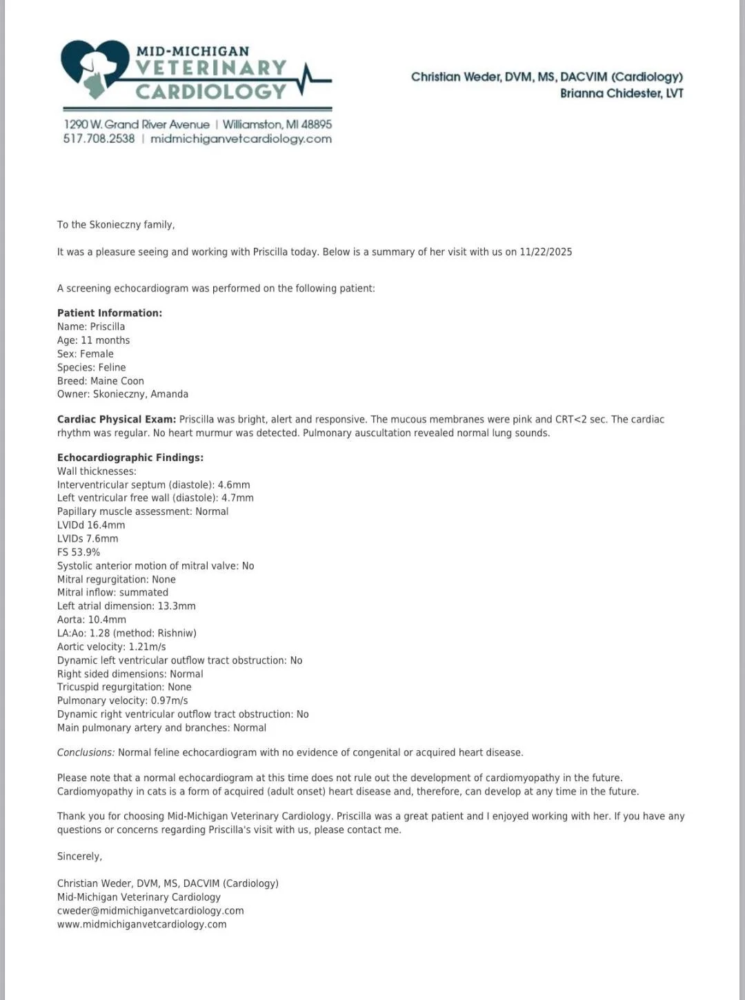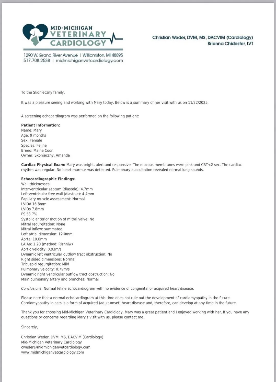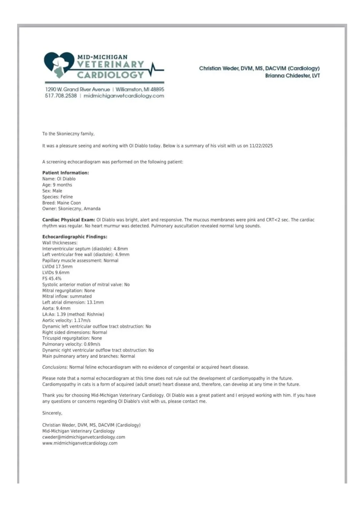 Echocardiograms performed by a board-certified veterinary cardiologist are one of the most important health screenings for Maine Coons, as the breed is predisposed to hypertrophic cardiomyopathy (HCM). Unlike genetic DNA panels, an echocardiogram evaluates the heart’s structure and function in real time, allowing early detection of abnormalities that may not be inherited through a single known gene. Because HCM can develop later in life, routine echocardiographic screening remains the gold standard for responsible breeding programs committed to reducing risk and protecting future generations.
